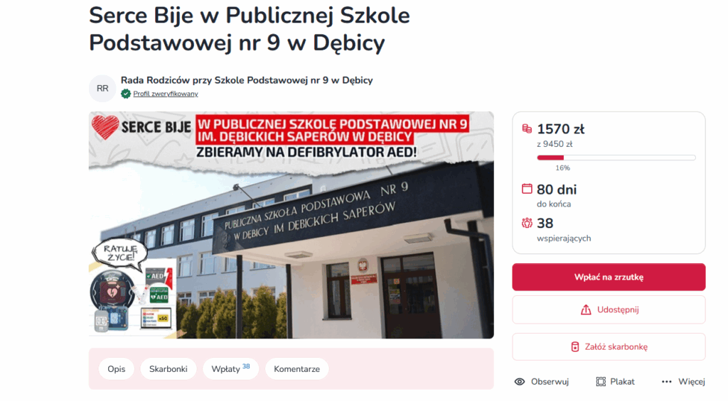 Szkoła Podstawowa nr 9 w Dębicy prowadzi zbiórkę na defibrylator AED w ramach programu „Serce Bije w Szkole”.
