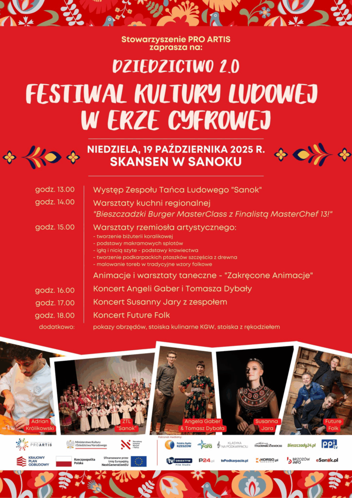 Dziedzictwo 2.0 to wydarzenie, które w nowoczesny sposób promuje kulturę ludową i dziedzictwo regionu. Na scenie wystąpią m.in. Zespół Tańca Ludowego Sanok, duet Angela Gaber & Tomasz Dybała, Susanna Jara z zespołem oraz popularny zespół Future Folk. Koncerty rozpoczną się o godzinie 13:00 i będą główną atrakcją festiwalu.