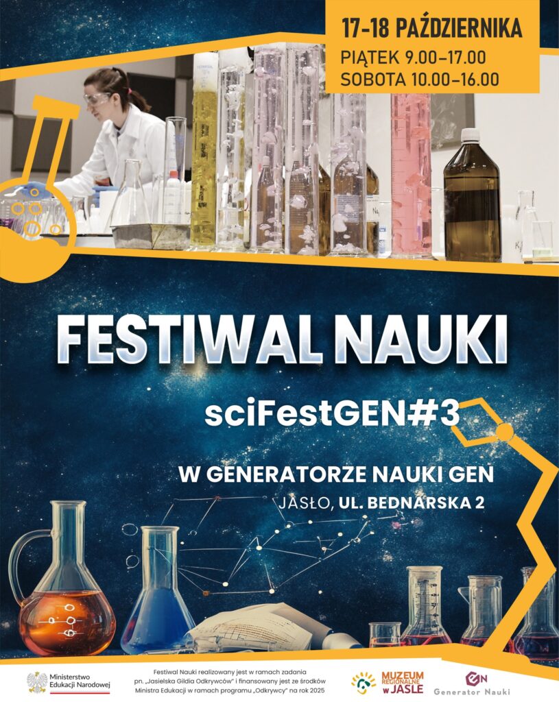 Generator Nauki GEN w Jaśle po raz trzeci zamieni się w centrum odkryć, doświadczeń i inspiracji. Festiwal Nauki sciFestGEN#3, który odbędzie się w najbliższy weekend 17 i 18 października, to propozycja dla wszystkich ciekawych świata — od najmłodszych odkrywców po dorosłych pasjonatów nauki. Wstęp na wszystkie wydarzenia jest bezpłatny.