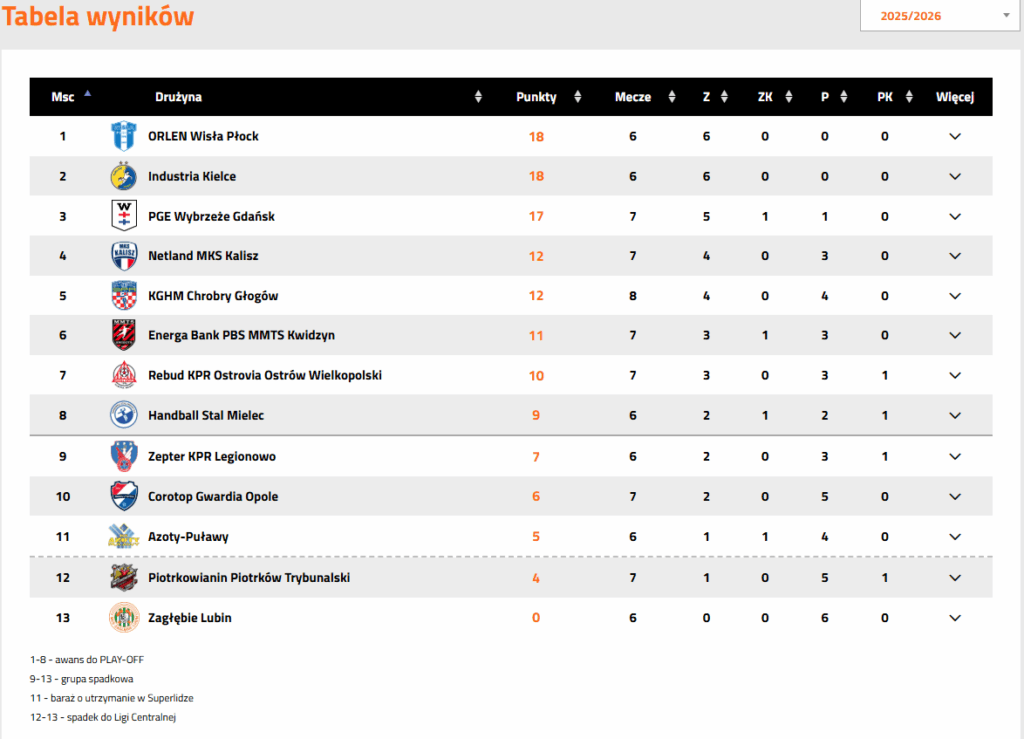 Aktualna tabela sezonu 2025/26 (stan na 18.10.2025)