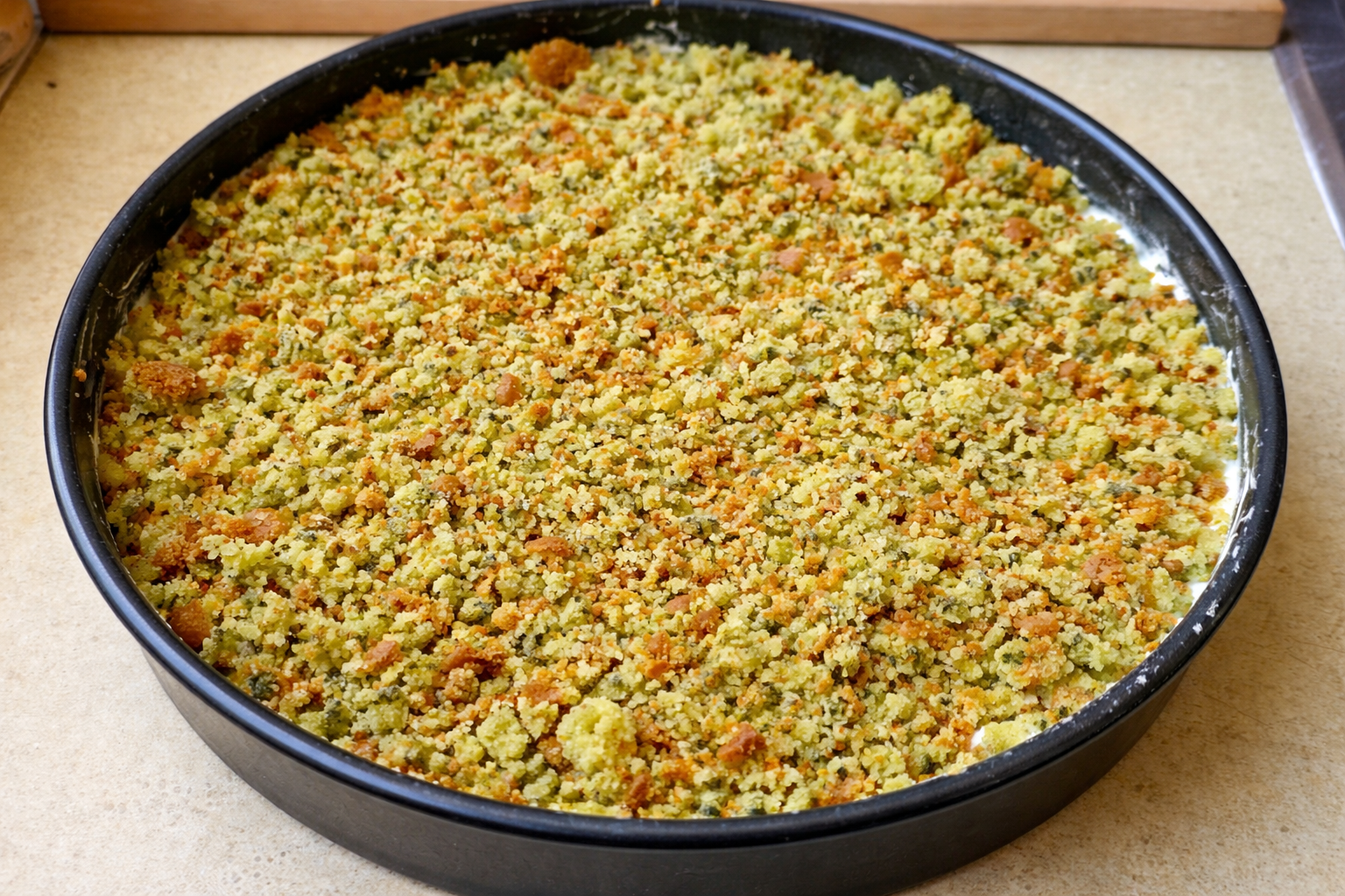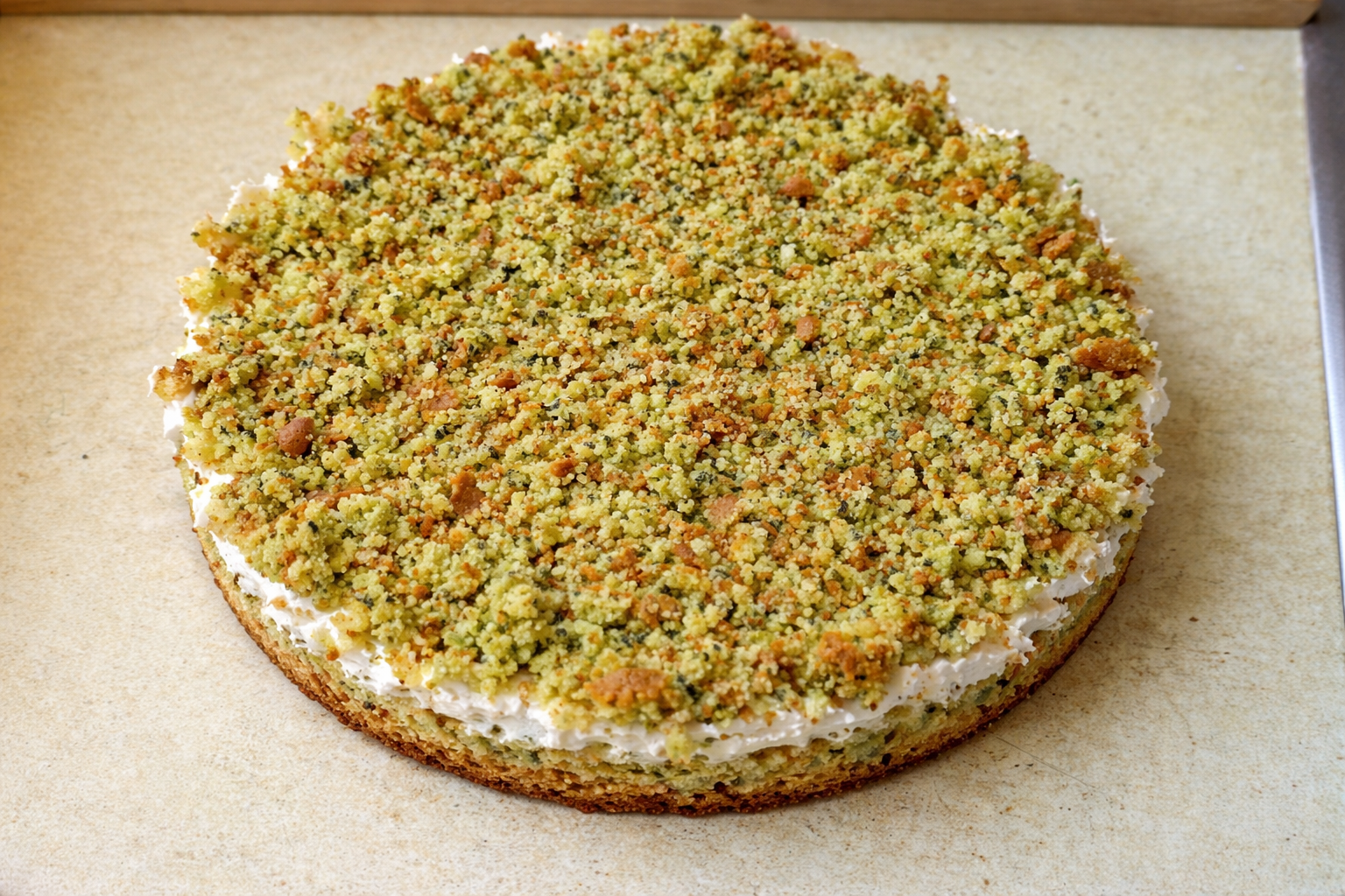 Na wystudzone ciasto wyłóż równomiernie krem śmietankowy. Następnie posyp całość pokruszonym ciastem, tworząc efekt leśnego mchu. Na wierzchu ułóż pestki granatu lub borówki.