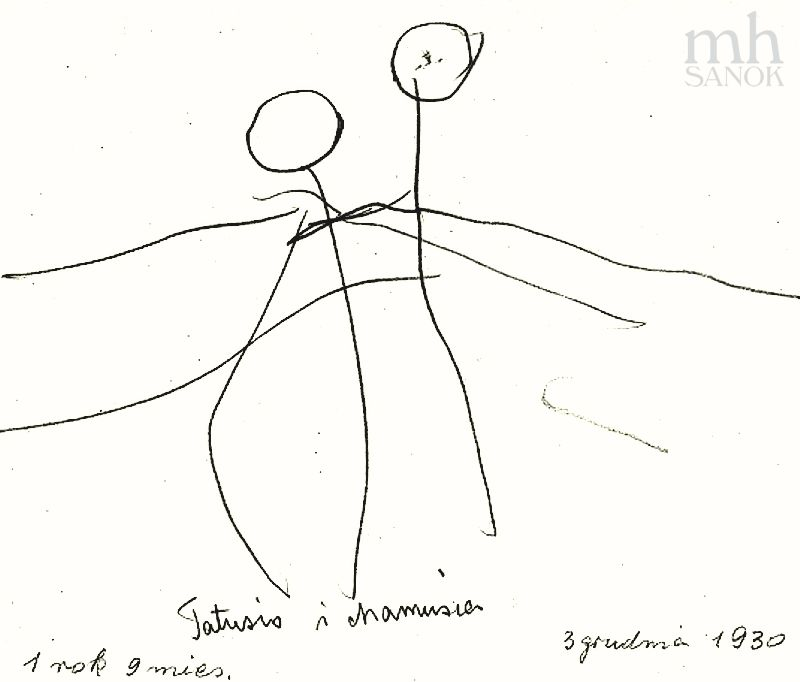 Zdzisio Beksiński, Tatusio i mamusia, 3.12.1930 r., najstarszy zachowany rysunek przyszłego artysty, podpisany przez mamę.