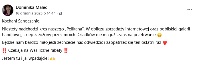 „Kochani Sanoczanie! Niestety nadchodzi kres naszego Pelikana” – tymi słowami Dominika Malec, wnuczka założycieli sklepu, poinformowała w mediach społecznościowych o decyzji, która dla wielu mieszkańców Sanoka okazała się ciosem. W krótkim, osobistym wpisie napisała wprost, że w obliczu sprzedaży internetowej i konkurencji pobliskiej galerii handlowej rodzinny sklep nie ma już szans na przetrwanie.