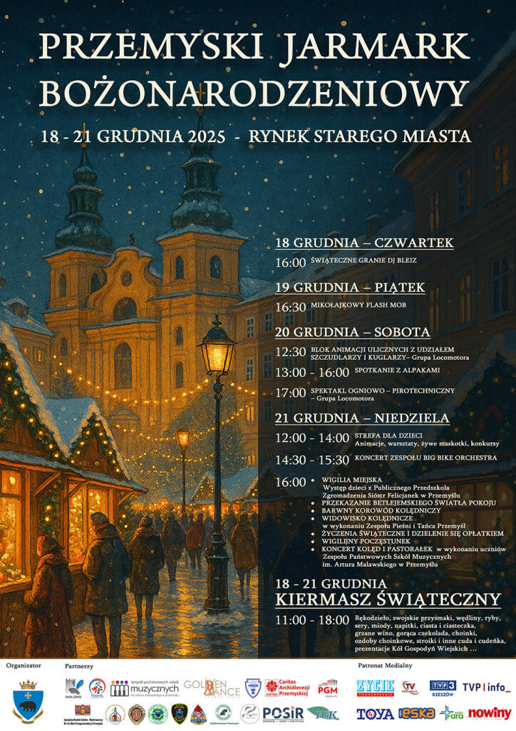 W sobotnie południe Rynek przejmują szczudlarze, kuglarze i uliczni animatorzy z grupy Locomotora. Nie brakuje też wydarzenia, które zawsze przyciąga tłumy. Od 13.00 do 16.00 na gości czekają alpaki, tworząc ciepłą i rodzinną atmosferę. Wieczór zamyka spektakl ogniowo-pirotechniczny, który rozświetla zimowe niebo nad Przemyślem.
