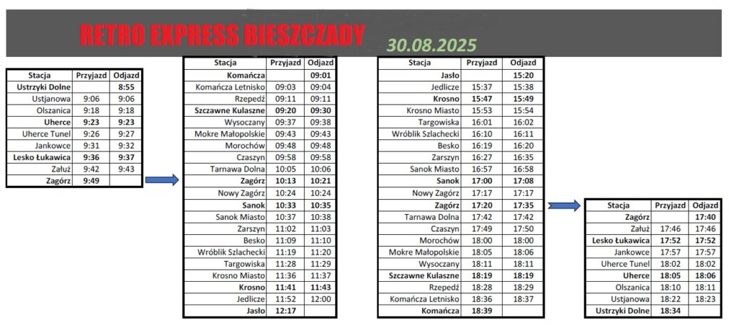 - Komańcza – godzina 9:01, zatrzymując się w Szczawnem, Mokrem i Morochowie, do Zagórza dojadą o 10:13.