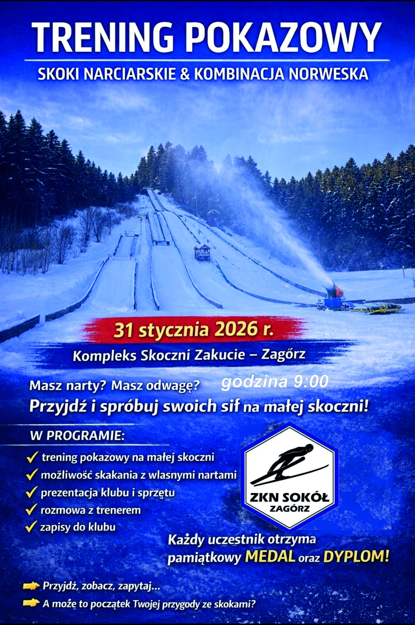 W sobotę 31 stycznia 2026 roku, o godzinie 9:00 na kompleksie skoczni Zakucie w Zagórzu odbędzie się trening pokazowy w skokach narciarskich. Organizowane przez klub ZKN Sokół Zagórz wydarzenie połączone będzie z atrakcjami dla uczestników, z których każdy otrzyma pamiątkowy medal.