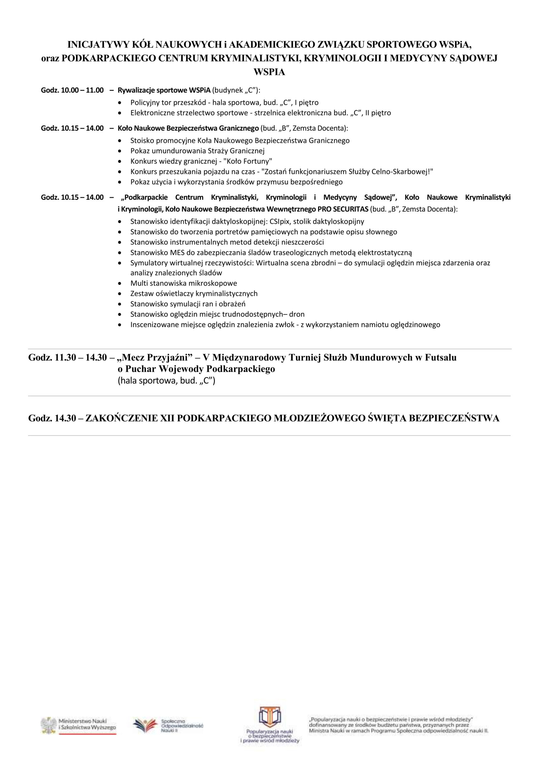 Nie zabraknie również rywalizacji sportowych. Akademicki Związek Sportowy WSPiA zorganizuje tor przeszkód, strzelectwo elektroniczne oraz V Międzynarodowy Turniej Służb Mundurowych w Futsalu o Puchar Wojewody Podkarpackiego.