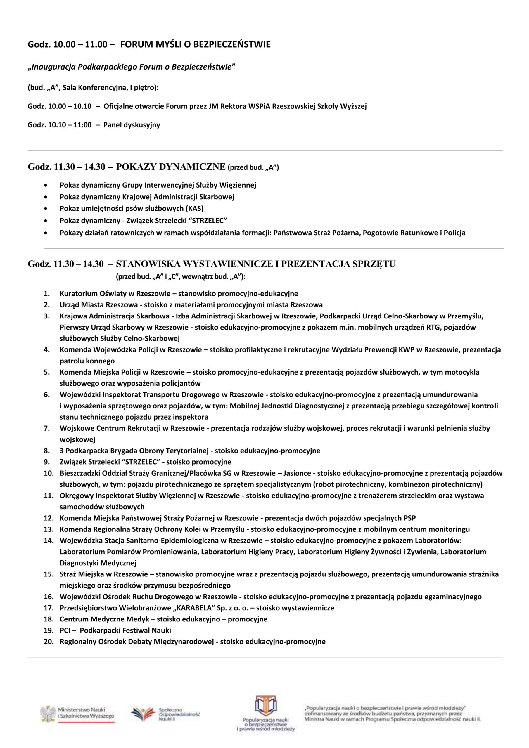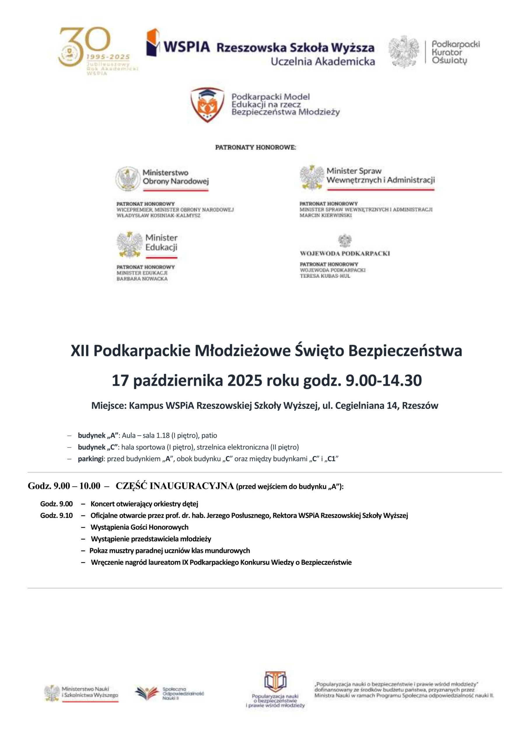 Uroczystość otworzy o godzinie 9:00 koncert orkiestry dętej, po którym uczestników powita Rektor WSPiA prof. Jerzy Posłuszny. Podczas części inauguracyjnej zaplanowano wystąpienia gości honorowych, pokaz musztry paradnej uczniów klas mundurowych oraz wręczenie nagród laureatom IX Podkarpackiego Konkursu Wiedzy o Bezpieczeństwie.